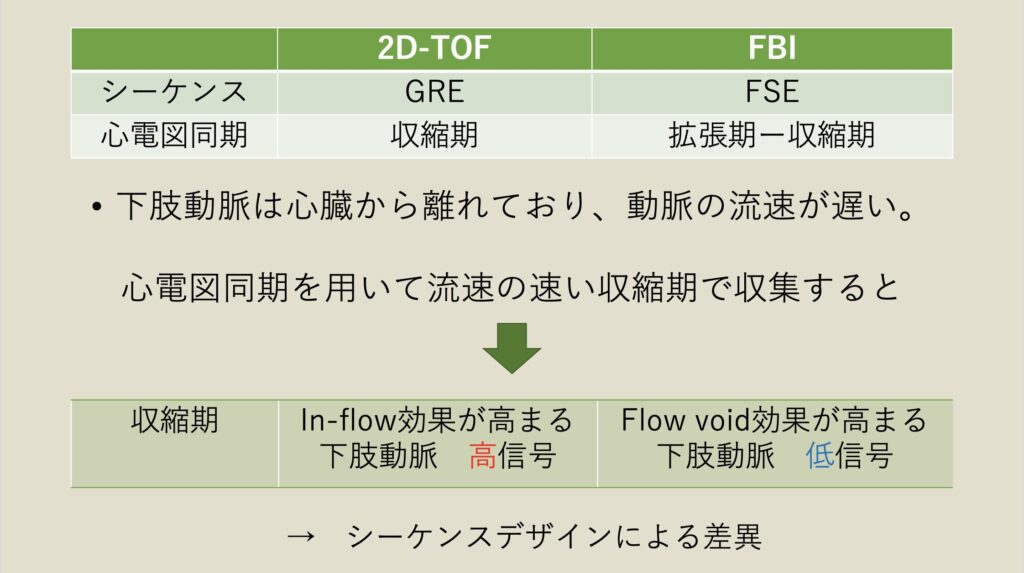 同じ心電図を用いた下肢動脈の描出方法で、「2D-TOF」と「FBI」が紛らわしいので表にしてまとめてみました。