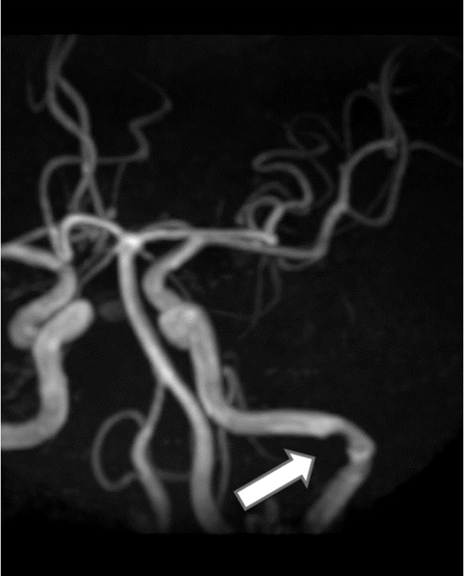 3D TOF-MRA MIP画像の内頚動脈の信号欠損(矢印)に関して血管狭窄以外に考えられる影響はどれか.(正解2つ)